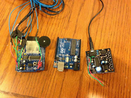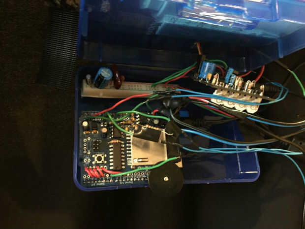 Alambré la salida de audio de la onda en el circuito de audio/servo y los altavoces, para que el audio se escucha y al mismo tiempo activar la mandíbula del cráneo. Usé un viejo adaptador de teléfono DC de 5V y 2A, cortar el enchufe y conectar los cables a un pedazo de placa que he usado para todas las conexiones de 5V y tierra. He añadido algunos capacitancia para limpiar algún ruido de fuente de energía que encontré llegar a la entrada de piezo y supera el umbral de tensión que elegi para los golpes "válidos", causando el Arduino responder cuando no quiero que. Los condensadores no deshacerse de todo el ruido, pero redujo lo suficiente como para que pudiese elegir un umbral de voltaje razonable para el piezo.