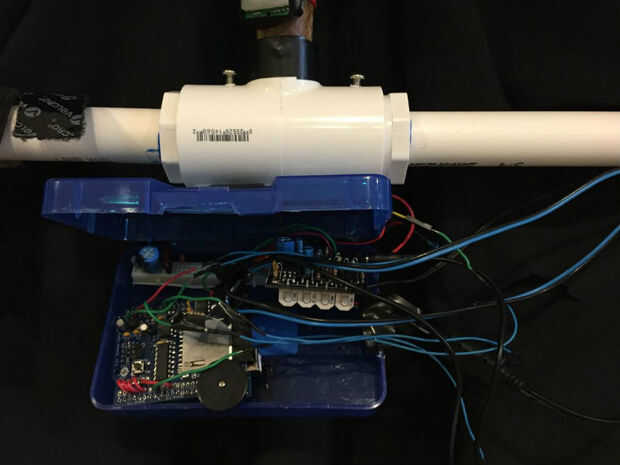 Ajuste el Arduino con el protector de la onda, el circuito de audio/servo, y la placa pieza todo en una caja de plástico y utiliza una tira de Velcro comando para unir al del PVC "T" que formaron la base del cuello. Entonces utilicé unas tiras de Velcro genéricas para reforzar el cuadro y dar algún alivio de tensión para el paquete de cables que sobresalen de la caja. Me aseguré que la electrónica y el cuerpo del PVC se ocultaban bajo el manto negro, con la excepción del sensor de PIR, por supuesto.