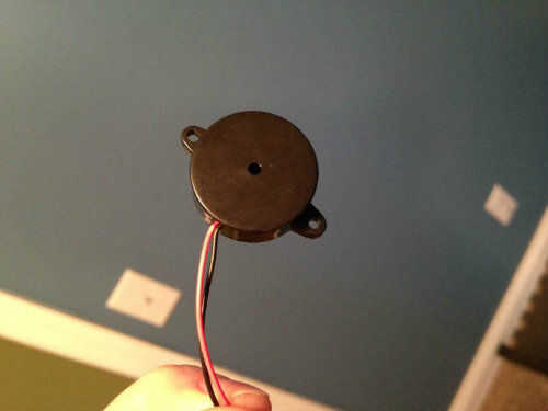 Cuando estudié algunos de los proyectos de arranque común de Arduino, vi que un zumbador piezoeléctrico puede utilizarse no sólo para producir sonido como salida, pero que podría también ser utilizado como una entrada a las vibraciones de sentido tales como golpes. Esto me tiene bastante emocionado mientras pensaba cómo Halloween sería el momento perfecto para utilizar golpes de puerta de temporada para iniciar comportamientos del cráneo. Había montado el timbre de mi puerta, grabado hacia abajo muy bien así como para recoger las vibraciones del golpe lo mejor posible y ocultó con decoraciones de Halloween. Envían el cableado por lo que la mayoría de los cables estaba en el interior de la puerta donde no podía verse. He conectado al pin A0 en el Arduino y había codificada con la idea básica de este ejemplo.