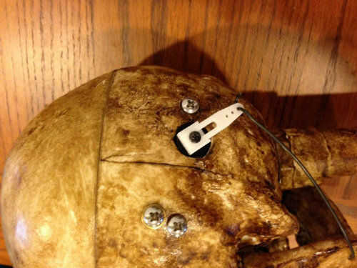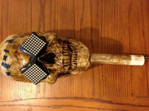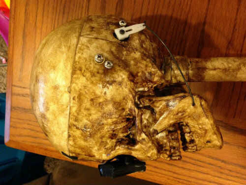 La manera en la que montara el servo, taladrar un agujero en la cabeza a través del cual el brazo del servo extendido y conectado al hueso de la mandíbula inferior con alambre, se inspiró en esqueleto de Halloween hablando de samseide. La idea de crear un "cuerpo" con tubería de PVC y el aspecto de manto negro y los altavoces también se inspiró en su instructivo.