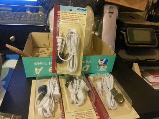 KIT de iluminación: tengo un kit de pre-fab de Lowe llamado el cable del interruptor Base candelabro. Vino con un cable de 8 pies, toma de luz y el interruptor todo premontado. Esta versión está realmente desnudo huesos (ha, ningún retruécano previsto) y la opción más barata que pude encontrar... usted puede conseguir mucho más de lujo con kits de botín, etc.... pero este intento, fui barato. Mi costo: $5,98 (x 4) = 23.92