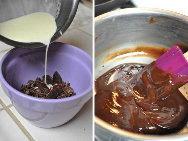 Para cualquier cantidad de chocolate se utiliza, calor alrededor de la mitad que la cantidad de crema en un baño María, revolviendo hasta que se formen pequeñas burbujas alrededor del borde.