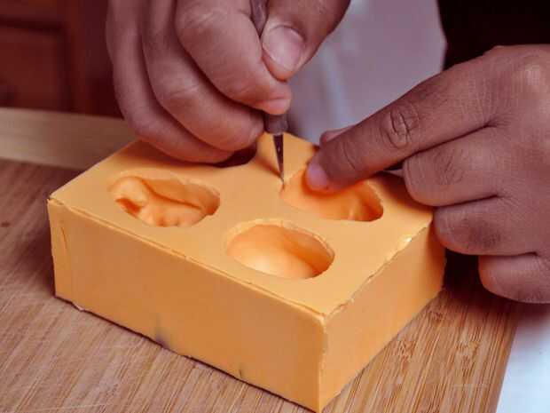 Esta marca de silicona curado completamente en unas 4 horas. Usted puede fácilmente comprobar si se realiza pulsando una moneda en la superficie para ver si deja una marca. Silicona curado será la primavera volver inmediatamente, no dejando ninguna huella en todo. Una vez ajustada, usted puede romper las paredes de la caja de acrílico del molde. Quitar la silicona de los originales, teniendo cuidado de no cortar o dañar la superficie. Usé un cuchillo Xacto para quitar alguna silicona que había filtrado en los cráneos.