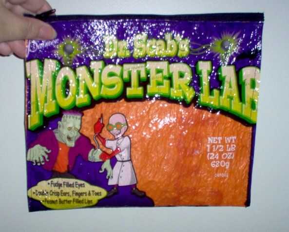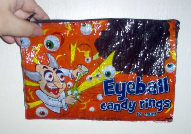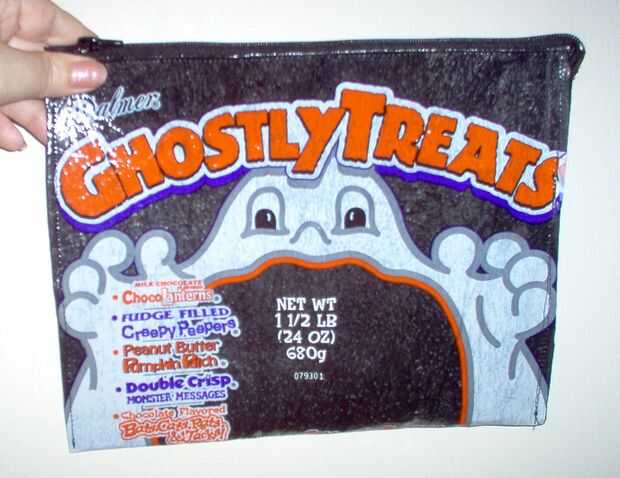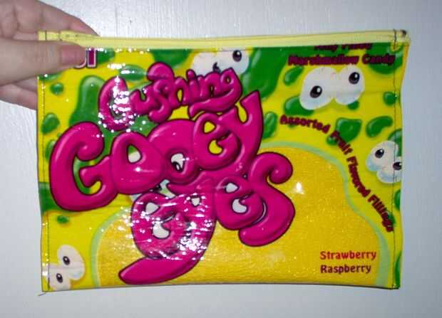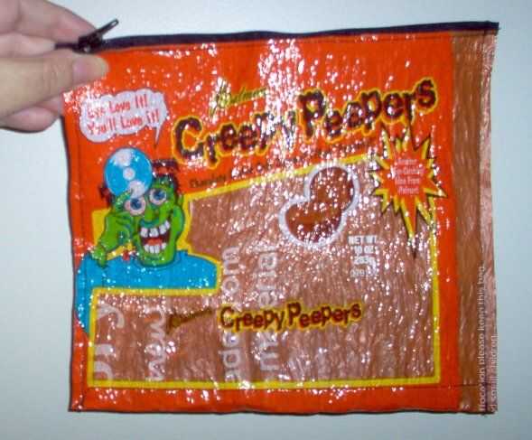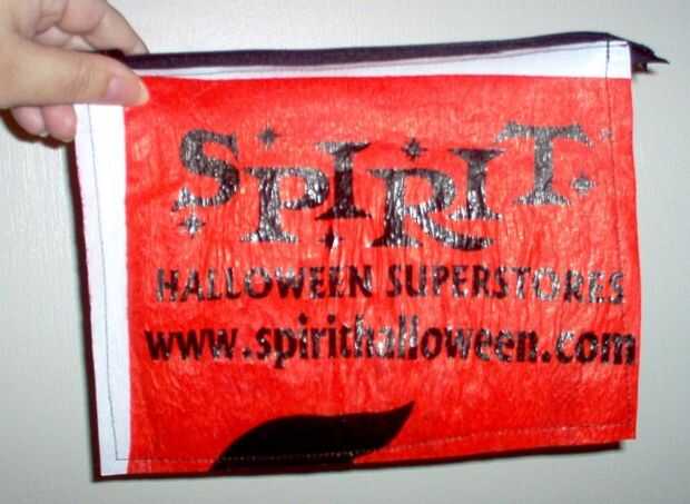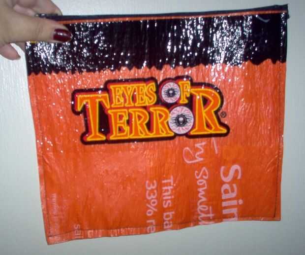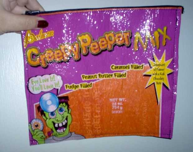 bolsas de dulces de Halloween tiene los mejores gráficos. Me upcycle en permanentes objetos útiles por fusión de varias capas de bolsas de plástico y luego coser el plástico fundido en accesorios y bolsos. Estos son algunos casos de lápiz con cierre o bolsas de maquillaje que hice de las bolsas de dulces de Halloween cool. La bolsa de bruja ganó Premio de tercer lugar en el concurso de Halloween DIY (en la categoría verde).