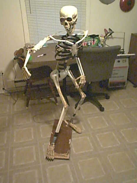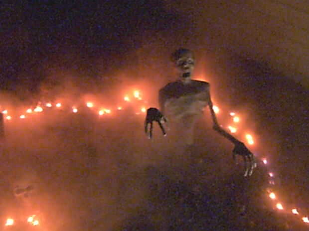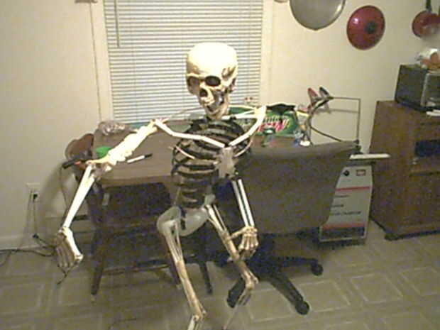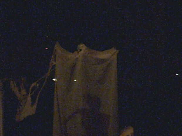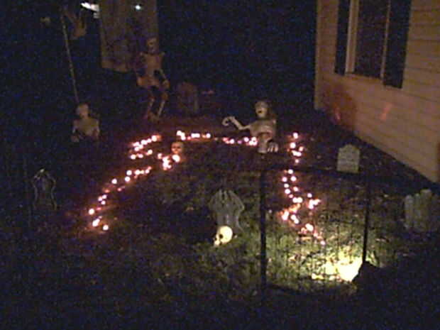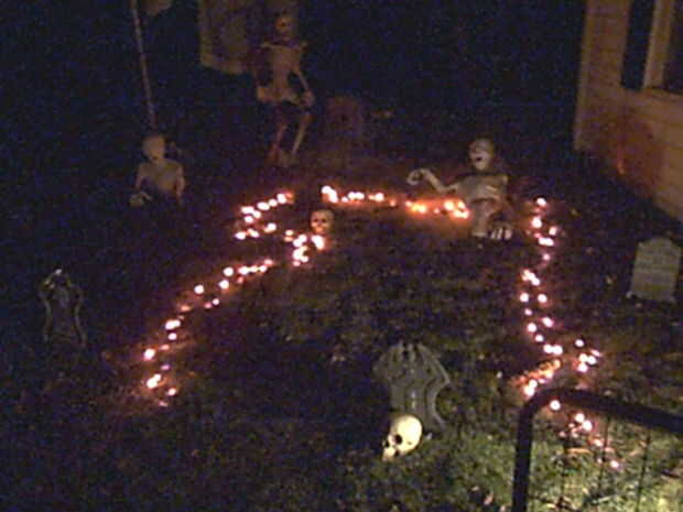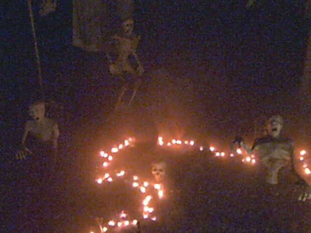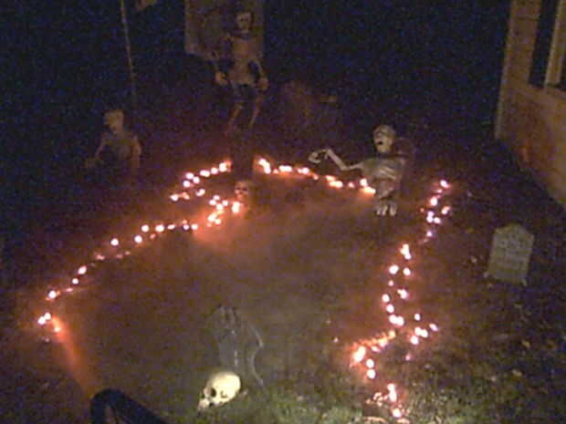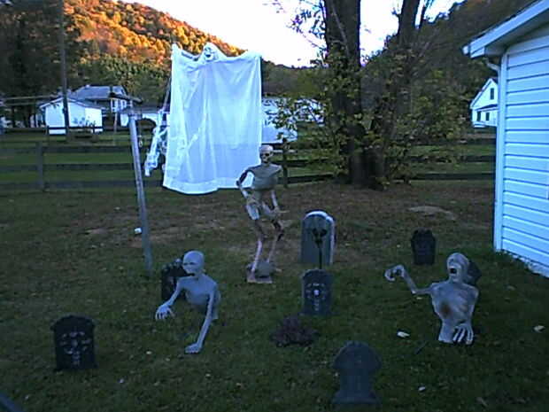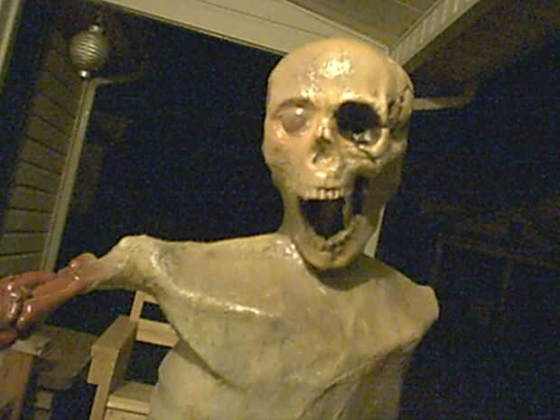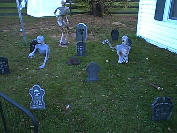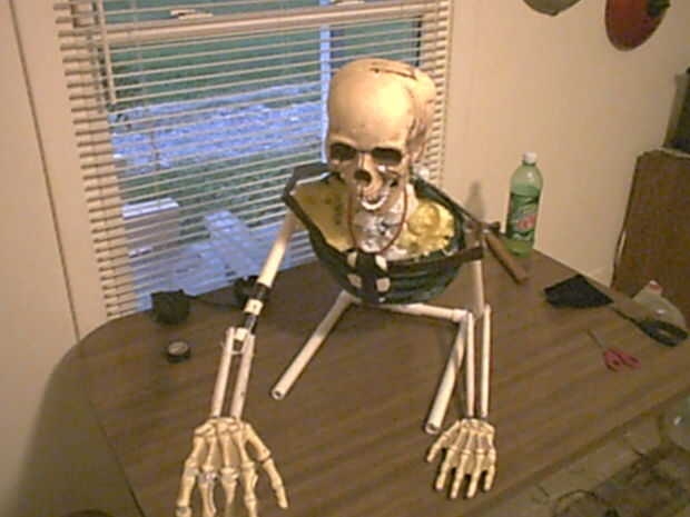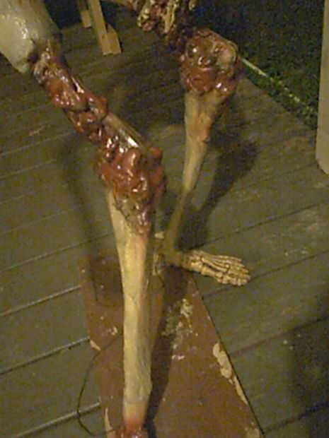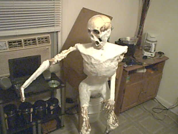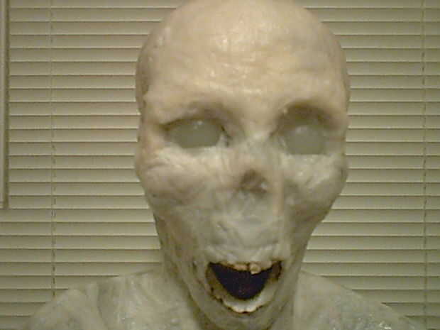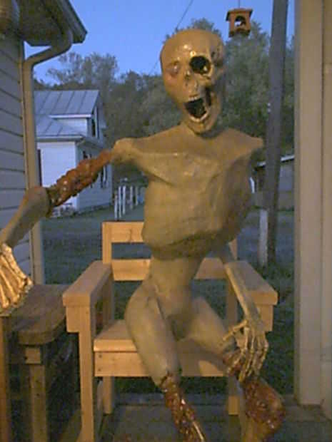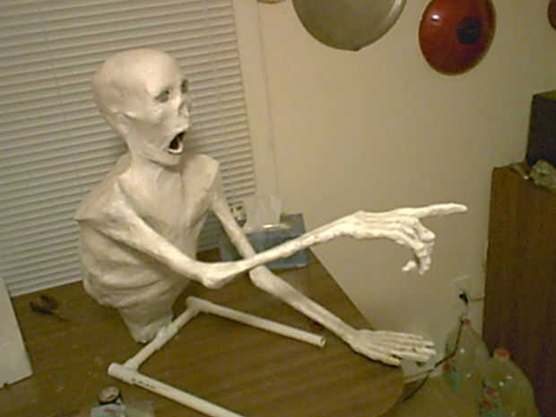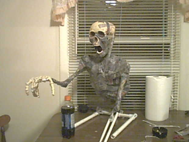 Los marcos para los zombies fueron hechos de tubo de pvc de 1/2 pulgada, manguera de jardín antiguo, perchas metálicas y algunas otras cosas. Estaban cubiertos con viejo periódico (papel maché) y luego con papel para darle un aspecto de carne podrida. Los ojos se hicieron poniendo pegamento caliente una cuchara de medida 1/2 cucharadita y esperar hasta que endureció.