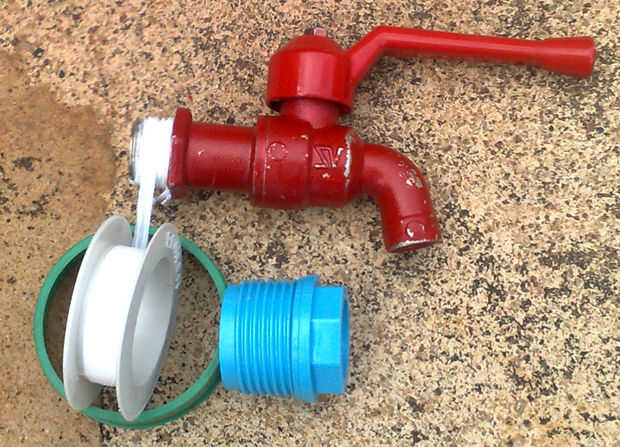 También compré un grifo y una guarnición plástica. La llave aquí ha sido pintado de color rojo durante una tentativa anterior, infructuoso hacer una olla. El grifo debe instalarse firmemente en la instalación antes de continuar. Un montón de cinta adhesiva de plomero ayuda a asegurar una junta estanca.