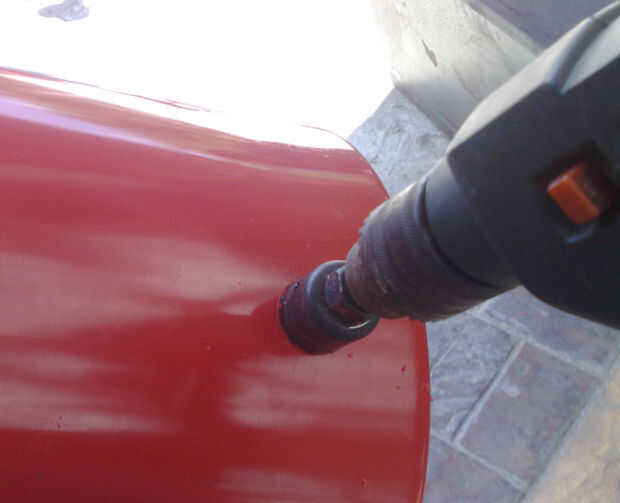 Usar un orificio de corte accesorio de taladro, con un diámetro apenas mayor que la llave de montaje, corte un agujero cerca de la parte inferior de la nevera. Esto es aproximadamente 1cm por encima de la parte interior inferior.