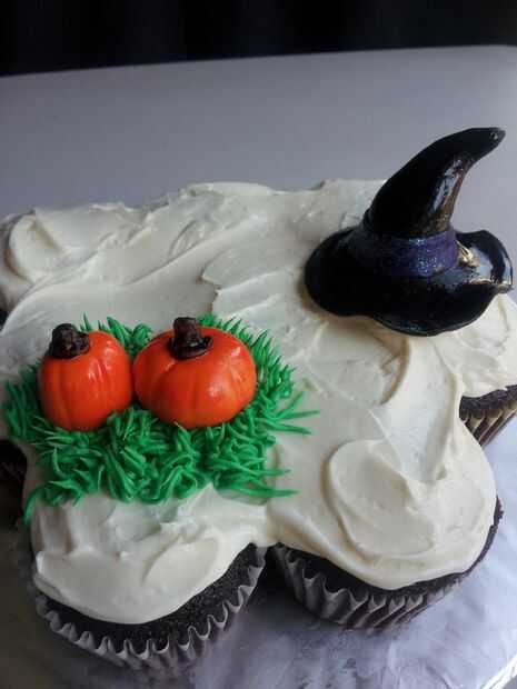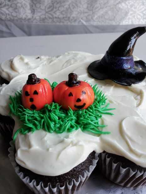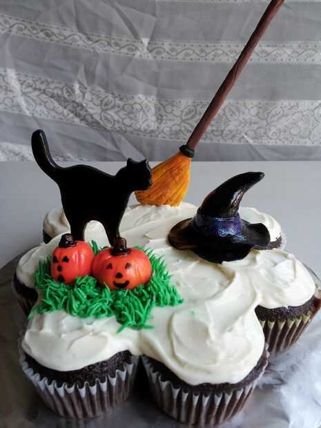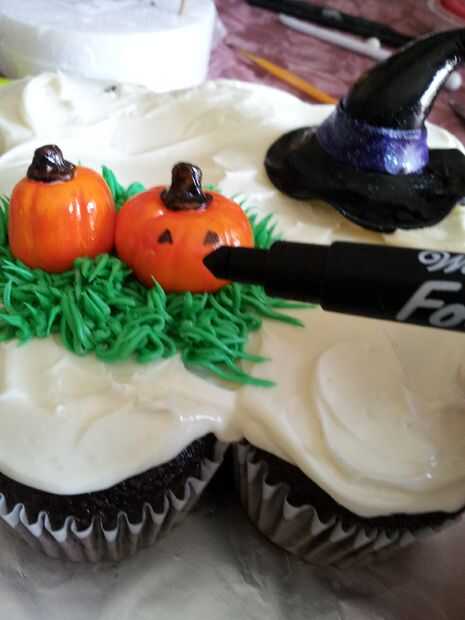 Pensé que necesitaba algo más así que decidí hacer un gato negro y hacer las calabazas jack o linternas. Así dibujaba caras con marcador comestible. No parecía tan limpio como quería así que agarré un pequeño pincel y pasó con la pintura de aerógrafo comestible negro. Para el gato a utilizar un cortador de galletas y pastillaje. Luego pintado negro. (Igual que en mi gato callejero puntal Magdalena instructable) Es hora de servir y hacer que la gente feliz con cupcuckes de halloween. : )