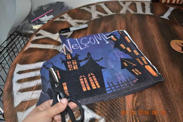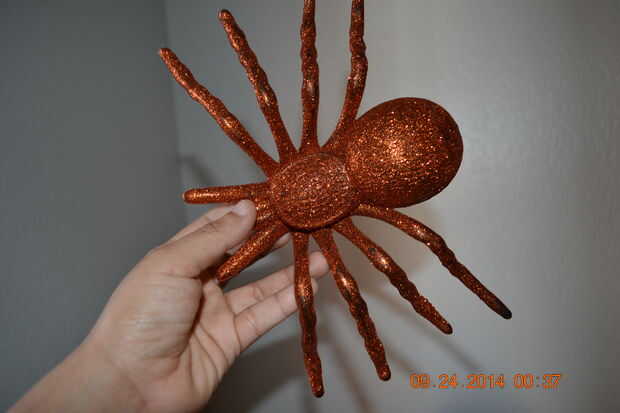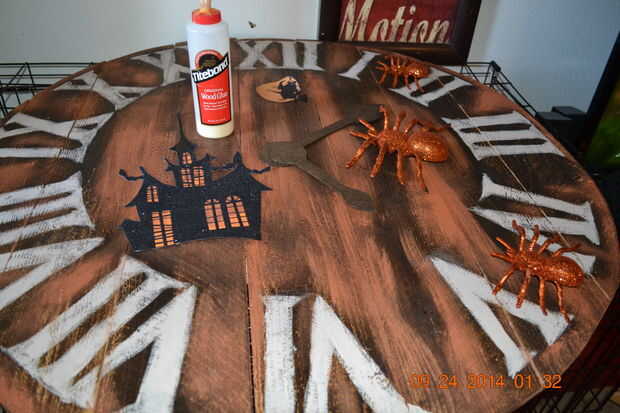 Lo ultimo que hice fue agregar algunas decoraciones de Halloween. Tenía un paño de lienzo, cortar hacia fuera de la casa y la luna desde allí. Puede encontrar esto en cualquier tienda de tela. También compré algunas arañas desde el almacén del dólar. Agregar tornillos a las arañas y las manos de reloj y pegar a la tela con pegamento de madera. Si desea colgar esto, todo lo que tienes que hacer es atornillar unos ganchos de colgar en la espalda y se fijan!