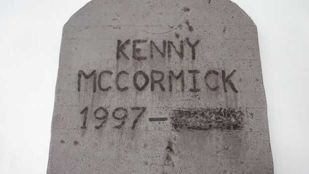 Lápidas que recogen mucha suciedad y el moho pueden desarrollar manchas oscuras debajo del tallado Letras y diseños. Agua de lluvia se acumula en las ranuras de los detalles tallados y gotea lentamente sobre la piedra por debajo de ellos. Esto oscurece la piedra debajo de las letras (especialmente las líneas verticales). A veces incluso se puede dar la apariencia que las letras se derriten.