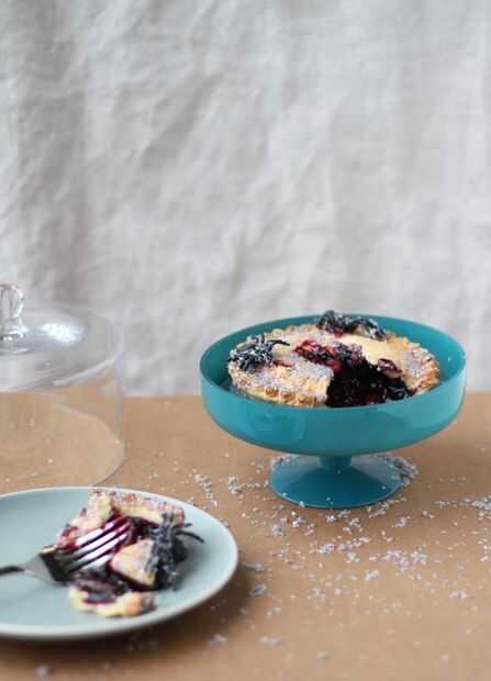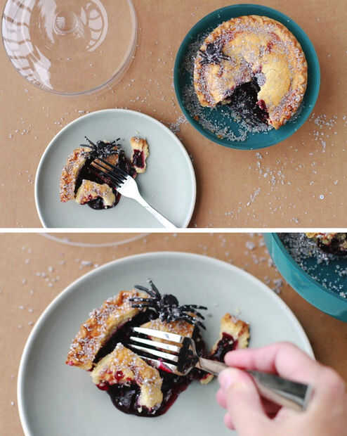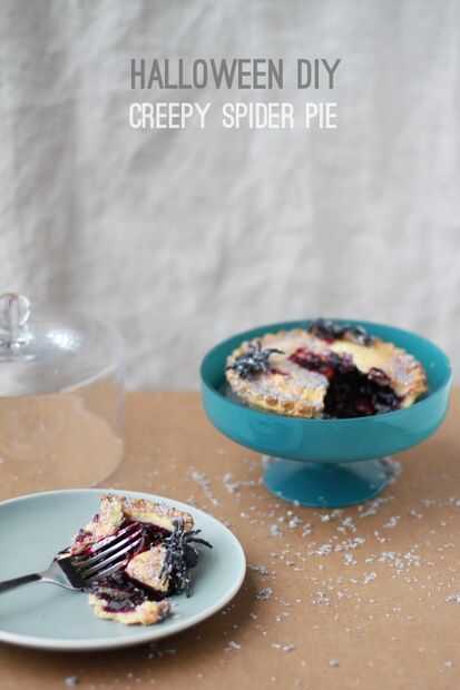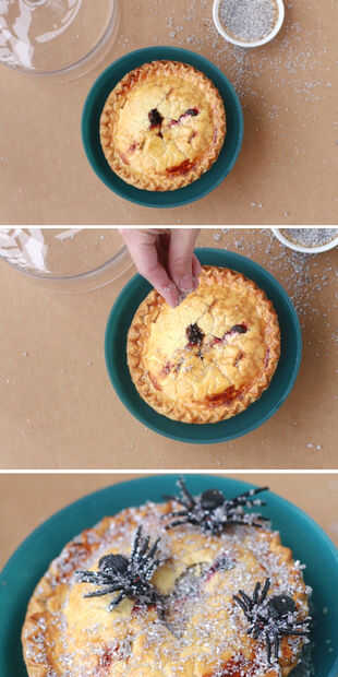 4. ahora es el momento para agarrar el pie. Blueberry funciona mejor porque tiene llenar de creepy, oscuro. Utilicé un pastel de la tienda compró, pero casera siempre es más sabrosa si tienes el tiempo.