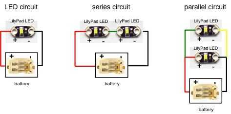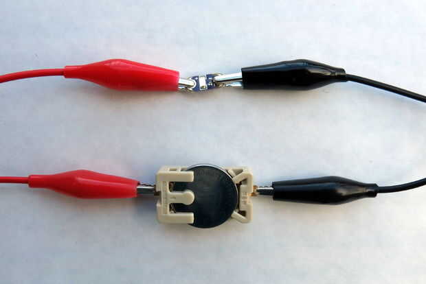 A continuación cifras muestran cómo probar tu circuito. El circuito de LED es uno sólo el que construyó. Los colores representan las pinzas cocodrilo.