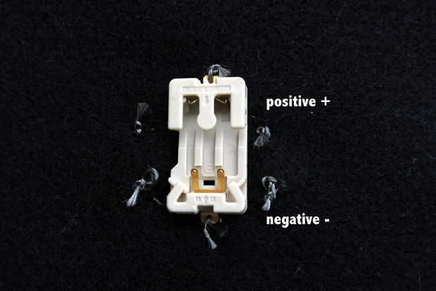 Cosa de la batería en el lado opuesto, conectando el positivo final de soporte de la batería a los extremos positivos de los LEDs.  Coser el extremo negativo del soporte de la batería a los extremos negativos de los LEDs.  Añadir en su batería y su LED deberá encenderse!