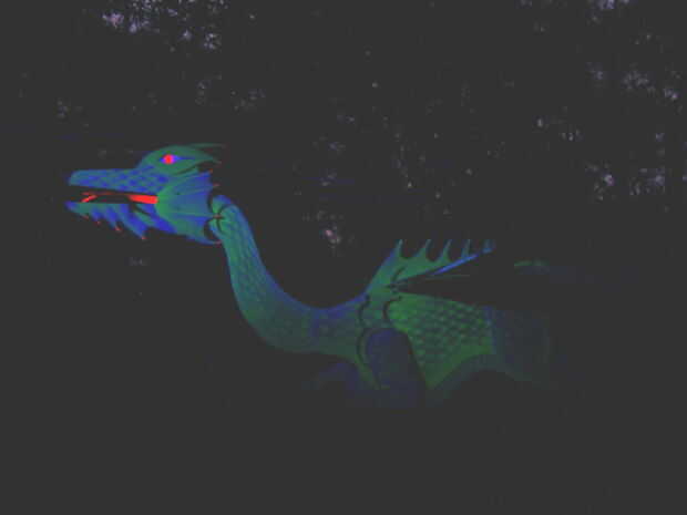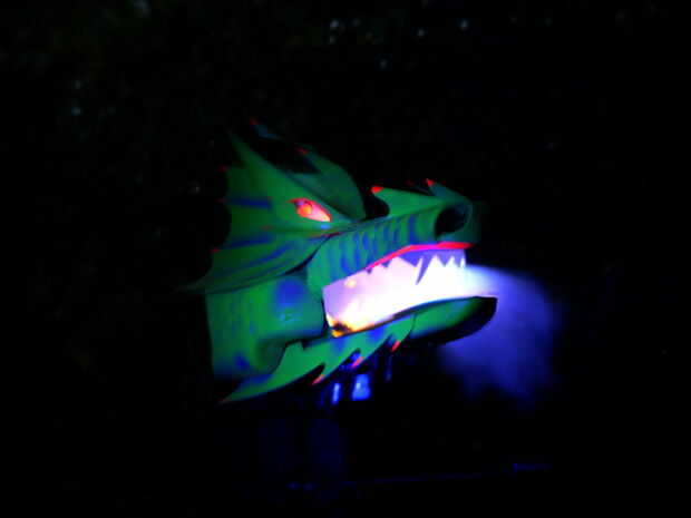 El otro dragón vuelve uv reactivo, esto funciona a lo largo de una tirolina aérea aleteando sus alas como va.