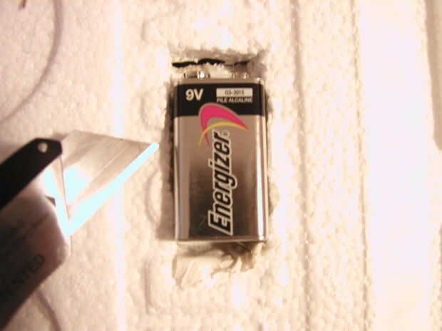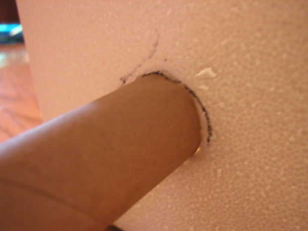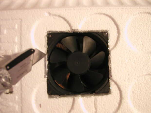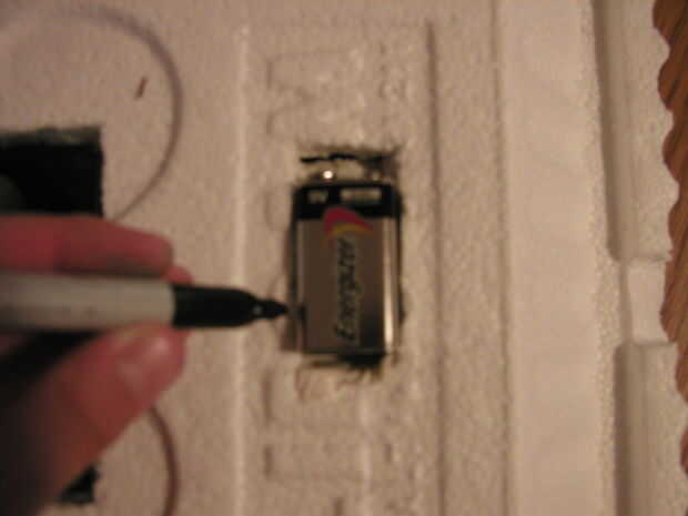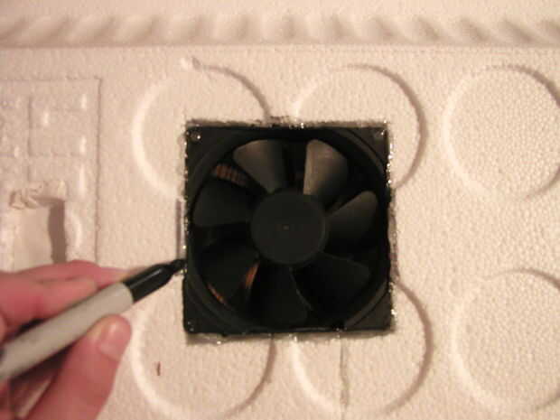 El primer paso es hacer los agujeros. Coloque el ventilador de la PC en el centro de la tapa y utilice el Sharpie para rastrearlo. Luego use el cuchillo para cortarlo hacia fuera. Para el tubo de toalla de papel, trace en el costado de la hielera y recórtalo. Por último, batería trace el 9V al lado del ventilador (no demasiado cerca) y cortar un agujero un poco más de la batería. Para todos estos agujeros de Corte completamente a través.