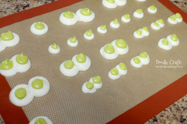 Luego hice unos ojos con candy melts. Sólo les derritió y ponerlos en la bolsa de hielo... y les hacia fuera en mi silpat. A partir de pupilas blancas, luego verdes y luego negro.