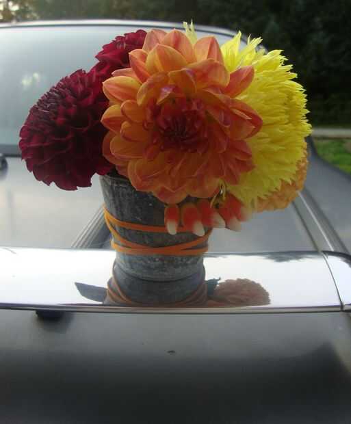 Vivo en la costa oeste y hemos tenido un verano muy tarde este año. Mi dahlia es todavía hasta. Me encanta tener flores frescas en Halloween. Si no tienes dahlia utiliza cualquier otra flor que es amarilla, naranja y rojo.