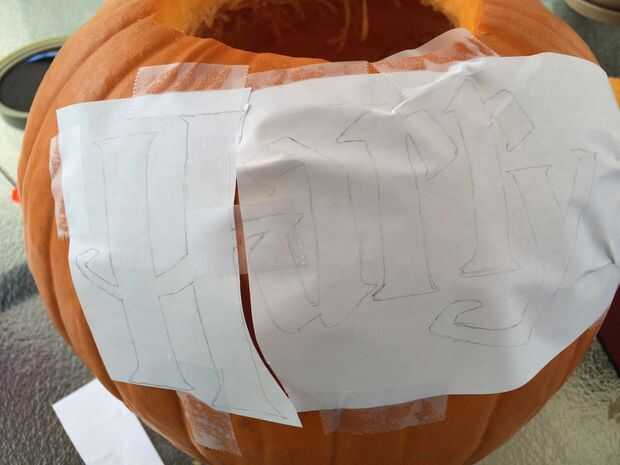 Llevará seguimiento de las cartas de Harry Potter y cortar la palabra HARRY. La cinta esa pieza en la parte superior de la calabaza para tallar. No te preocupes si el papel se arruga para arriba, esta parte sólo requiere mucha concentración para poner la cinta derecha. Tuvimos que cortar la H por separado, por lo que tendrás que hacer eso también.