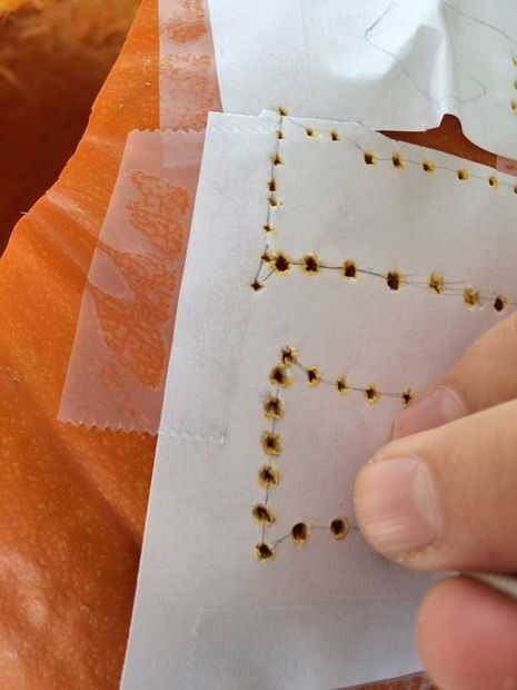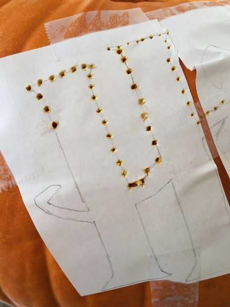 Se utilizó un clavo (cosa que creo que sería mejor debería funcionar) para empujar los agujeros a través de las líneas en el papel y en la calabaza. Así, puede despegar el papel y tallar donde están los agujeros.