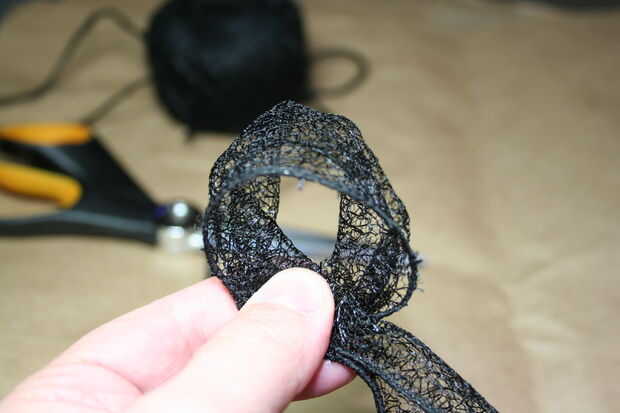 Hacer un arco con sus 2 1/2 pulgadas de cinta ancha negra. Cinta corte la longitud deseada con unas tijeras. Dejando una longitud de cinta para la cola, hacer una figura de ocho.  Tamaño de bucles debe determinarse por el tamaño del arco deseado.  Sujeta la cinta en el centro, hacer otro ocho encima de la primera de ellas. Repita el proceso hasta que el número de bucles se forma.  Deja una longitud de cinta para una cola equivalente a la longitud de la cola primera.  Pellizcar el centro del arco y bucles de centro se reúnen. Envuelva firmemente alambre floral alrededor de centro de arco para garantizar.  Tire de cada circuito y la forma como se desee.  Si es necesario, corte el alambre floral con tijeras. Pegar a la corona.