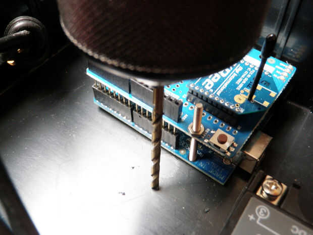 En lugar de una batería de 9V, perfore otro agujero de 1/8" en la parte inferior de la caja.