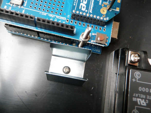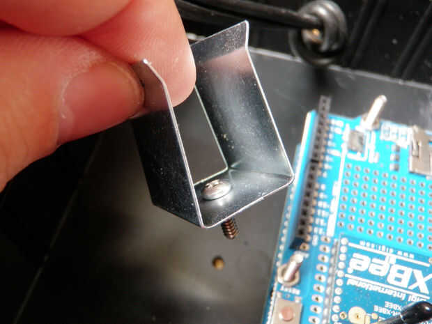 Fije el soporte de la batería de 9V a este lugar con una tuerca y un tornillo.