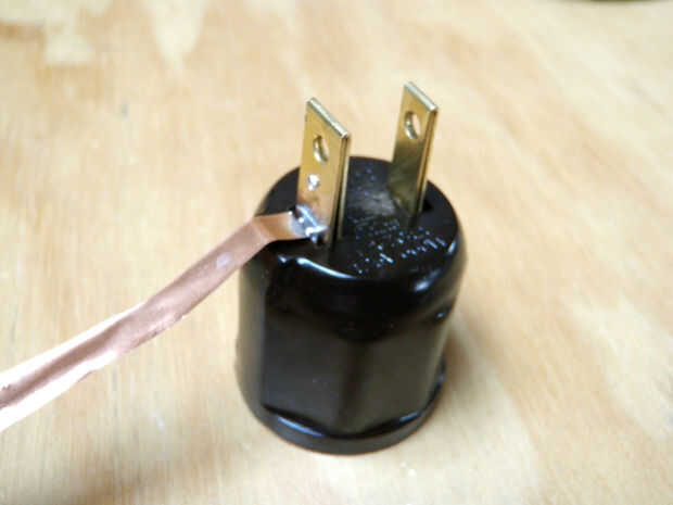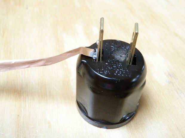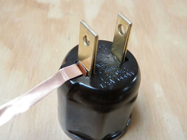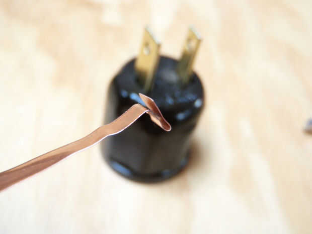 Corte una tira larga fina de cobre de la hoja es el ancho de una de las clavijas del enchufe en el tomacorriente.