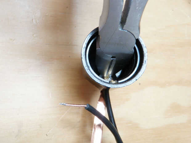 Pasar un cable de la lámpara en el agujero que perforó y soldadura a la parte superior de este conector.