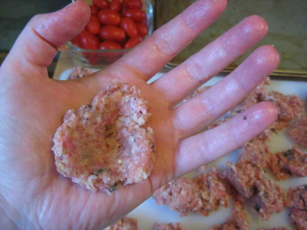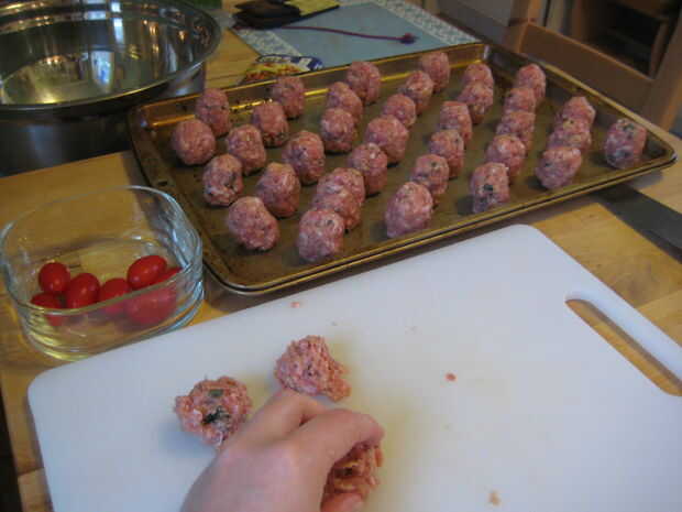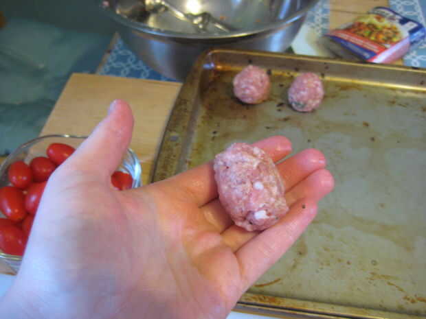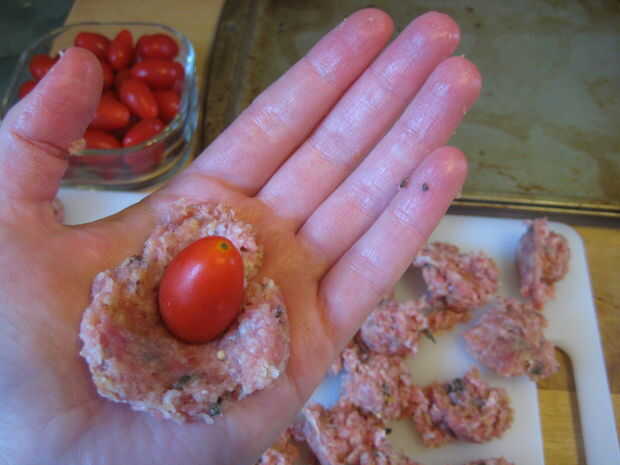 Aplana una bola de carne en la palma de tu mano y colocar un tomate en el centro de la carne. Cierre suavemente la carne alrededor del tomate, teniendo la precaución de cubrir totalmente el tomate. No trate de la albóndiga del balanceo entre las manos - el deslizamiento del tomate causa la carne deslizar completamente. Coloque cada albóndiga acabado en una hoja de galletas forradas de aluminio. La lámina hace que limpiar