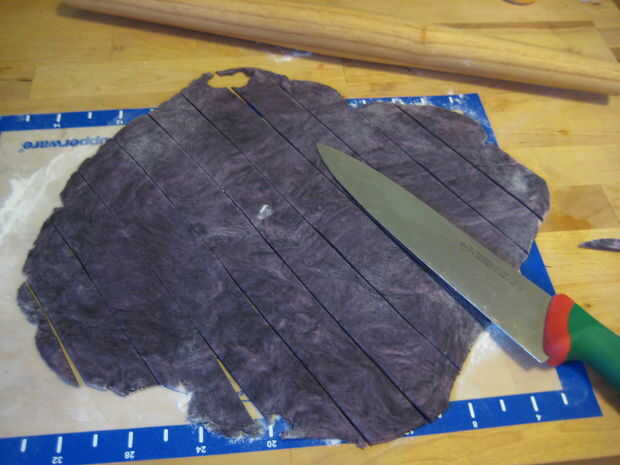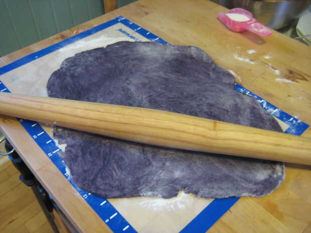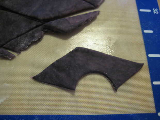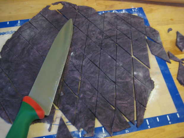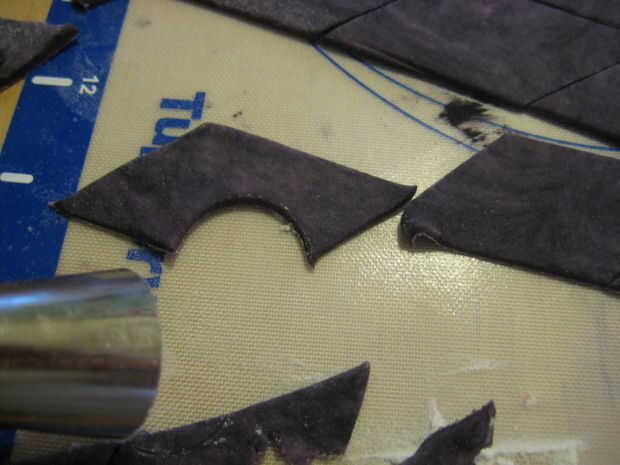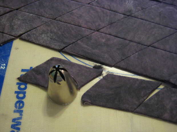 Sobre una superficie ligeramente enharinada, estirar masa de empanada con un grosor de 1/8 de pulgada. Con un gran cuchillo corte las alas. En primer lugar, hacer cortes verticales en la masa de 1-1/2 pulgadas aparte. Hacer una segunda serie de cortes en diagonal para crear formas de diamante, también 1-1/2 pulgadas de distancia. Con un pequeño corte pastelería o sustituto (yo usé una boquilla de pastelería), corte una sección redonda de la parte inferior de cada ala. Ver la serie de fotos a continuación de una idea clara de cómo cortar las alas de murciélago.