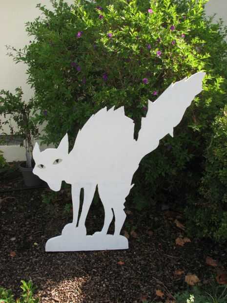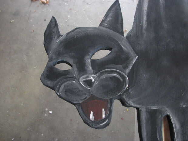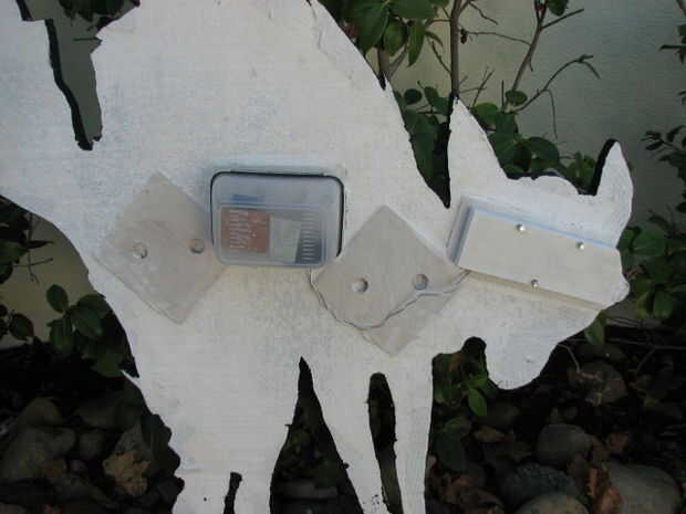 El gato era corte de espuma de 1", cubierto con una sábana de algodón y pintado con pintura resistente al agua y acrílicos (ver nuestros engranajes Steampunk instructable para técnica). Refuerzos de madera se pegan con pegamento de uretano a la espalda de vínculos de participación y para montar los componentes electrónicos.