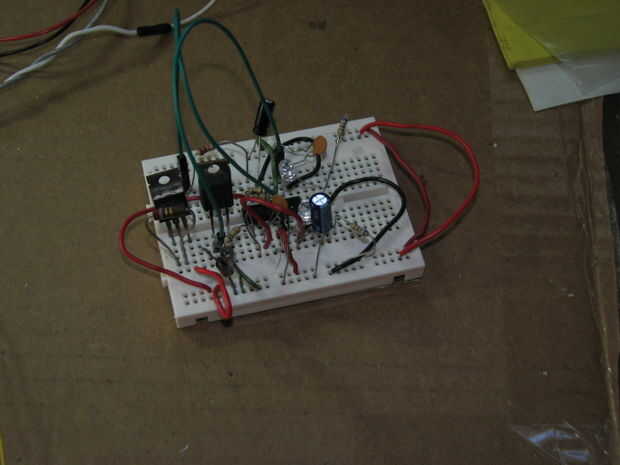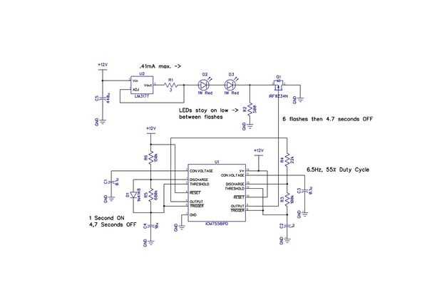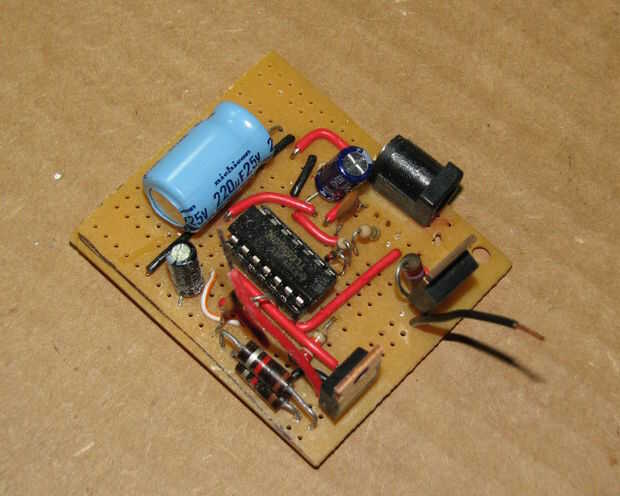 Hacer los ojos flash de vez en cuando agrega una divertida sorpresa. Un temporizador C 556 (dos 555 CMOS) yo solía dar 6 destellos rápidos y espere 5 segundos. Breadboarded rápidamente y luego hizo un circuito excepcional en un diseño de tablero material del PWB. Un transformador de 12V 600mA suministra energía - las baterías no duran noche tras noche.