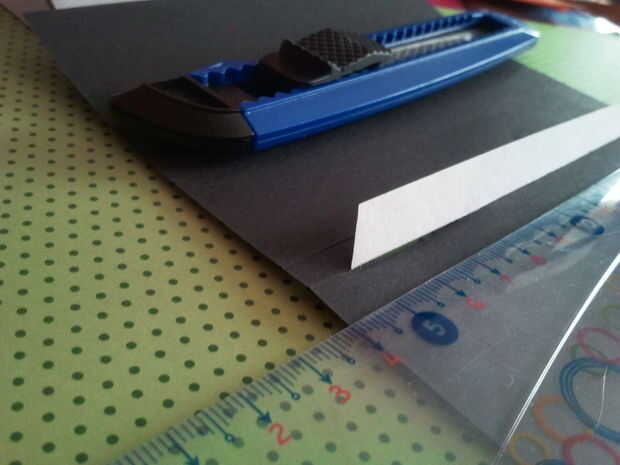 6. corte a lo largo el papel negro, para hacer una larga pieza que usted utilizará para cubrir el conjunto. No ajuste la longitud ahora, simplemente cortar toda la longitud del papel negro, por supuesto incluyendo la frontera de 1cm en la parte superior, como en la parte inferior.