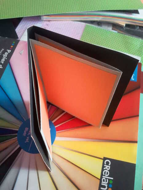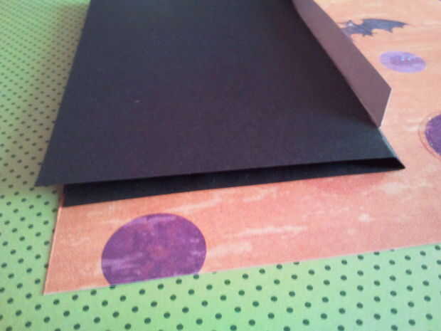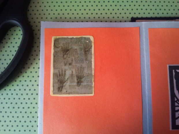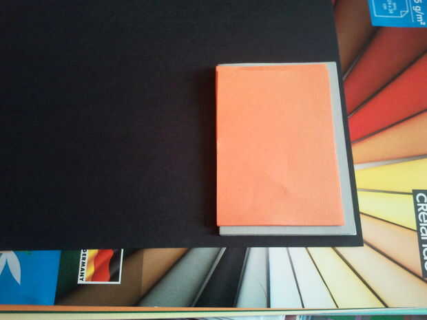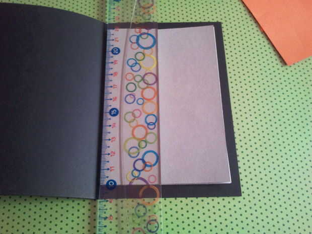 5. Tome un pedazo de cartón negro papier, coloque las páginas gris + naranja dentro, como foto 8. Una vez más, creo que va a dejar un borde, alrededor de 1 cm en el lado. Así que coloque las páginas en una esquina, con una distancia de 1 cm.