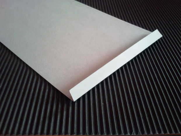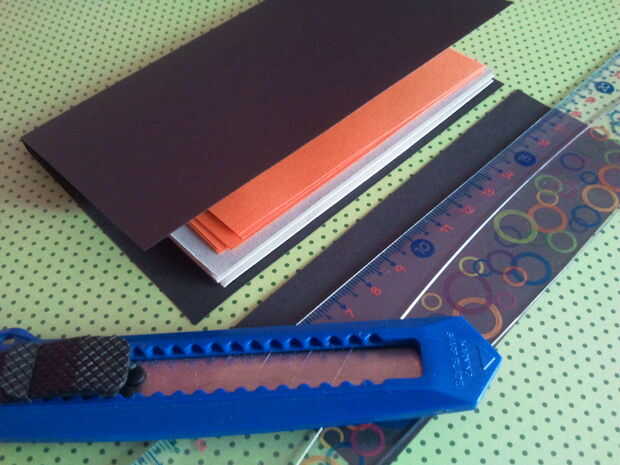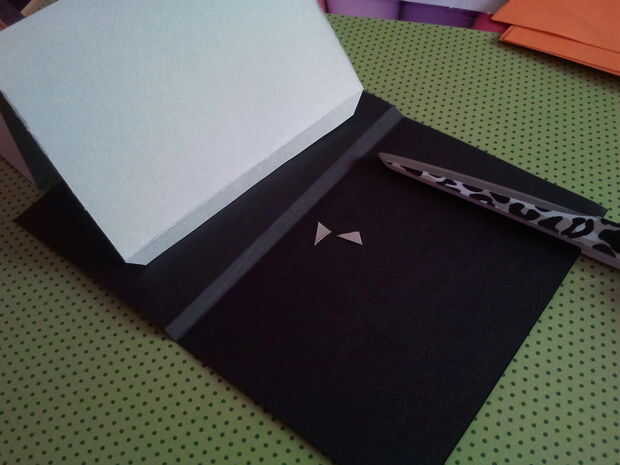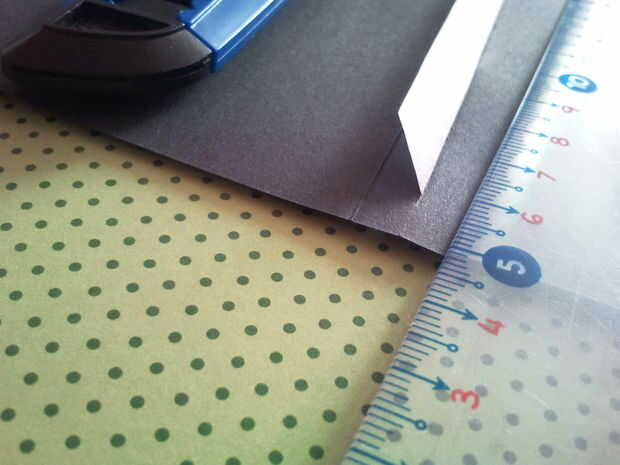 9. con un cortador, que vas a hacer un corte largo a lo largo de la parte doblada de la columna vertebral, en el papel negro. En este corte largo, se deslizará el pequeño lado doblado del papel gris.