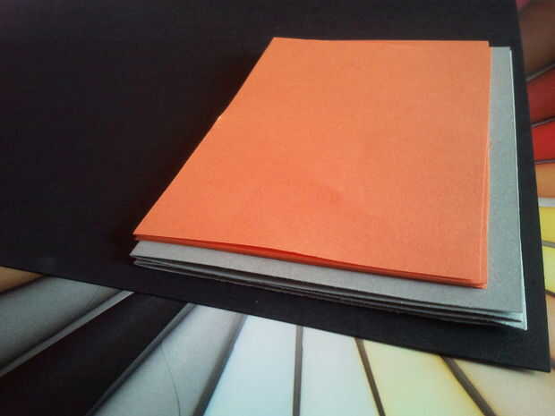 necesitan: tijeras, cutter, 3 pedazos de cartulina A4 (negros, gris y texturadas para la cubierta) y un A4 colorean papel impresora normal (naranja).