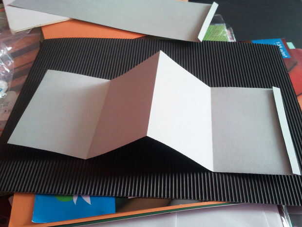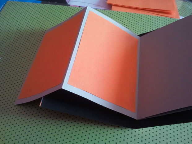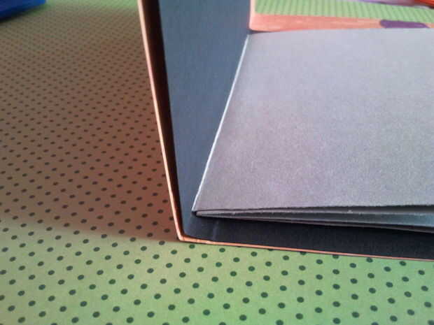 a. doble una vez para crear la cubierta posterior. Ver exactamente cómo altura hacen su papel gris + naranja papel: una vez montado con pegamento, que se ven de la misma y es importante su cubierta tiene el tamaño correcto para la columna vertebral.