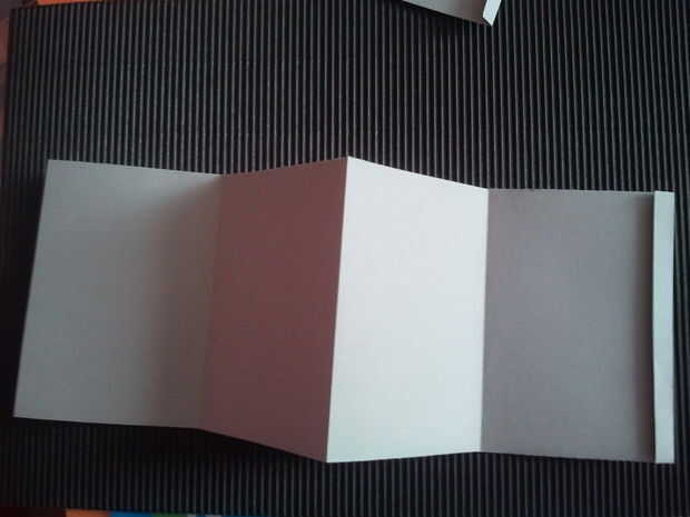 1. Tome un pedazo largo de papel de la cartulina, como el gris. Las dimensiones no son importantes, sólo tiene que ser tan largo como usted quiere hacer 4 páginas + un lil' más para doblar al final (esta parte doblada será dentro del notebook, para sostener a la cubierta). Para este tomé una hoja A4 que doblado y cortado en 2 partes muchas, y tomé una de estas piezas.