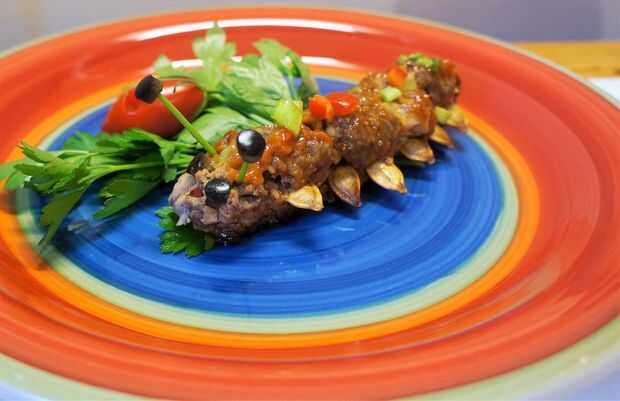 para una cena de Halloween entre amigos, decidí crear un plato de murciélagos gooey, tripa llena, asado con sus alas y acompañado de salsa de sangre además. Previamente había hecho un plato de murciélagos tripa llena con tomates grandes, pero he deci