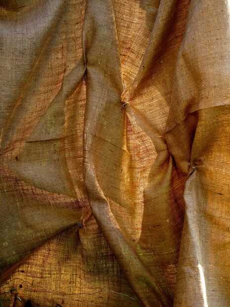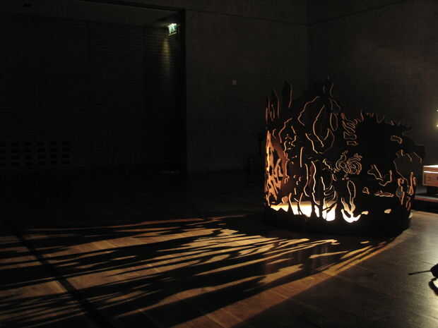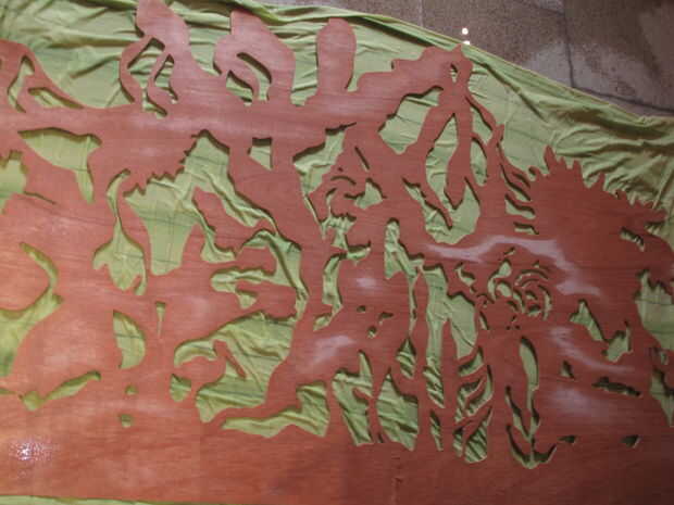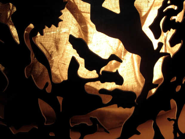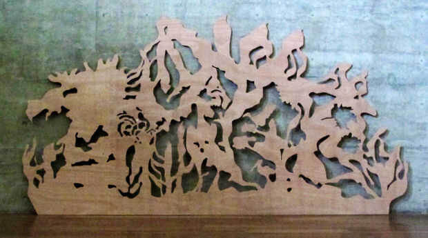 Pieza de diseño creada con madera contrachapada para las siluetas de animales. Tejido arpillera escultura con alambre de aluminio para hacer las llamas.