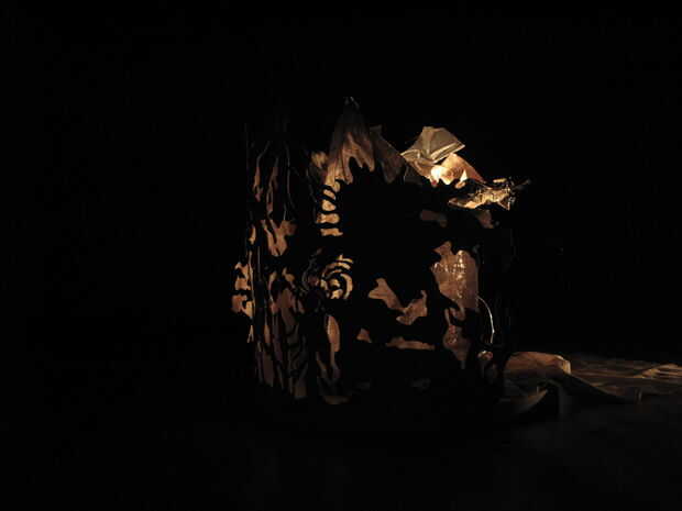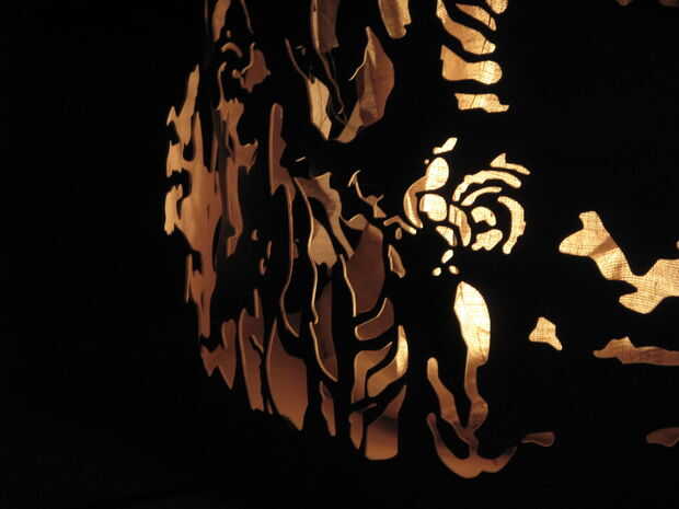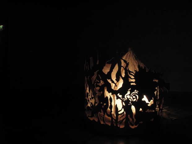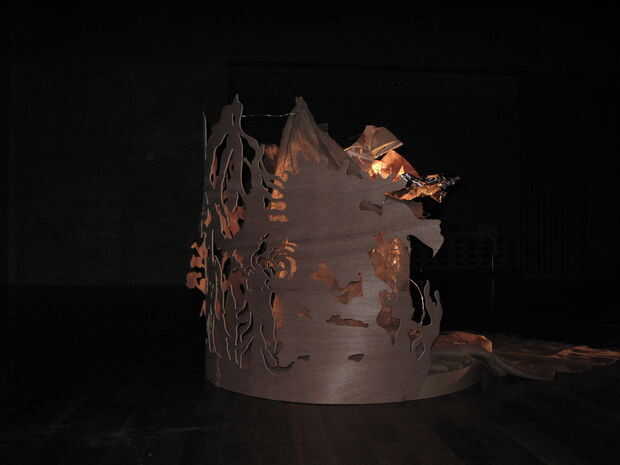 El dibujo inicial fue hecho en photoshop y luego importado en AutoCAD para producir dibujos de escala. El archivo DWG fue enviado a una empresa de corte por chorro de agua. El fuego todo es iluminado con un lugar de retroproyector en el interior plataforma MDF de 3' - 8" de diámetro. La principal herramienta para conectar todo junto y para envolver la madera contrachapada alrededor era un taladro de Fein , incluso inalámbrico potente. El mejor material a utilizar hubiese sido 3 m m MDF. Sin embargo, tenía que ver con lo que la empresa de chorro de agua ya había en el sitio. Que complicar las cosas un poco y añadir un paso adicional. Como se puede ver en uno de los cuadros, tenía completamente empapar la madera con agua caliente para hacer posible la curva. Gracias a un calentador de cerámica del teatro que ayudó a secar la superficie del piso más rápido. Salud y la seguridad importa mucho en un teatro!