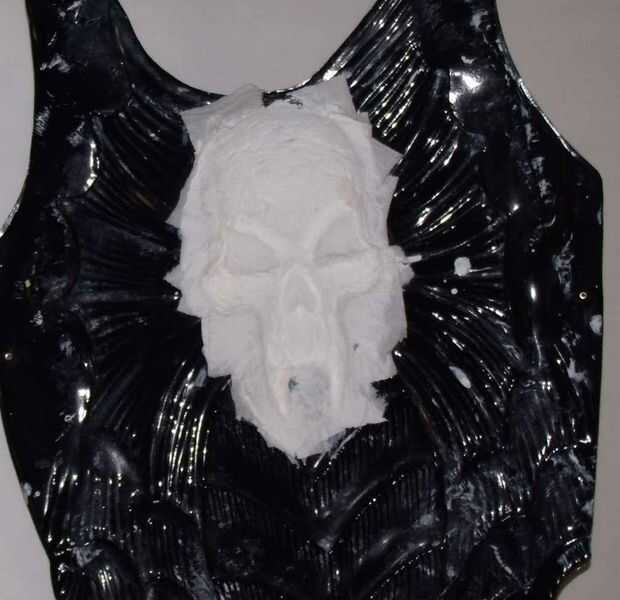 Estoy usando una plástico decoración de halloween con la impresión de un cráneo como el molde, acodar arrancó pedazos de tejido de tocador o la nariz con pintura acrílica, un agente de adherencia de soldadura/Unión forma un plástico duro como forma. Como fibra de vidrio y resina el tejido añade fuerza a la pintura seca
