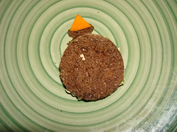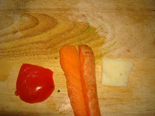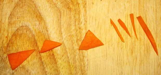 Corte de zanahorias y queso o pan blanco o nabo, como se muestra para la cola, pico, ojos y el círculo en el centro de la frente. Guardar unas zanahorias para guarnición.