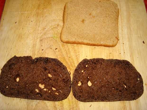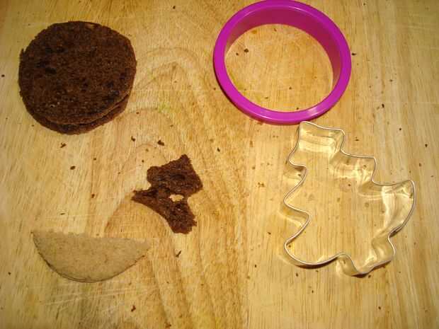 Cortar el pan negro en rebanadas finas 2. Cortar dos círculos de pan negro para la cara.