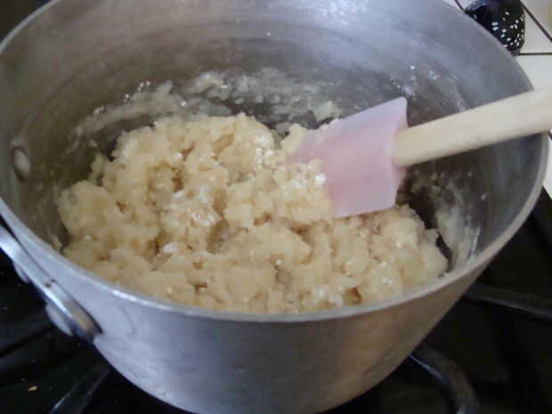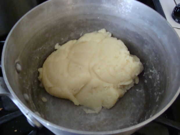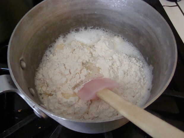 una vez que hierva, volcar la harina y revolver con una espátula de goma. Cuando comienza a venir juntos, al calor para bajo pero continuar revolviendo. en uno o dos minutos, se habrá transformado en un grupo apretado de la pasta. no debería ser pegajoso al tacto, y debe haber algunos ado res en la olla o pote.