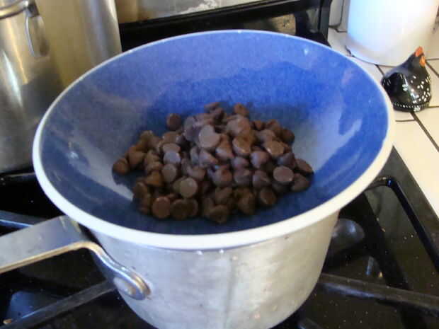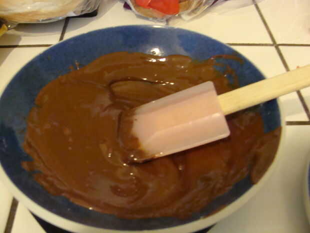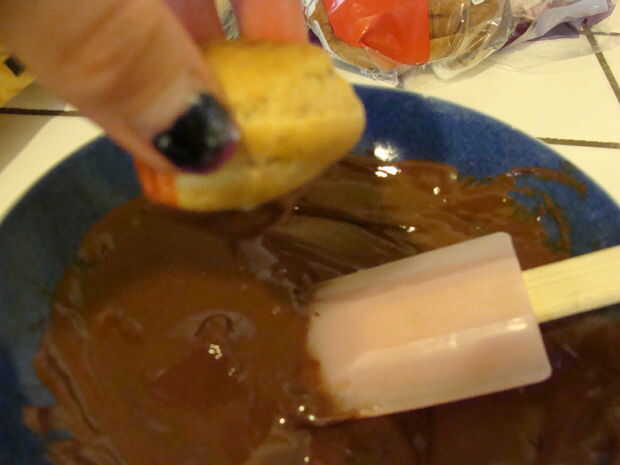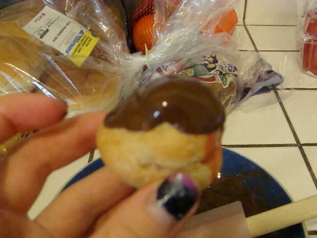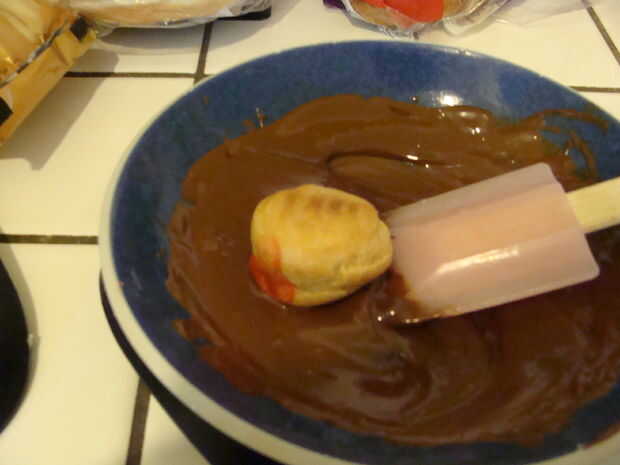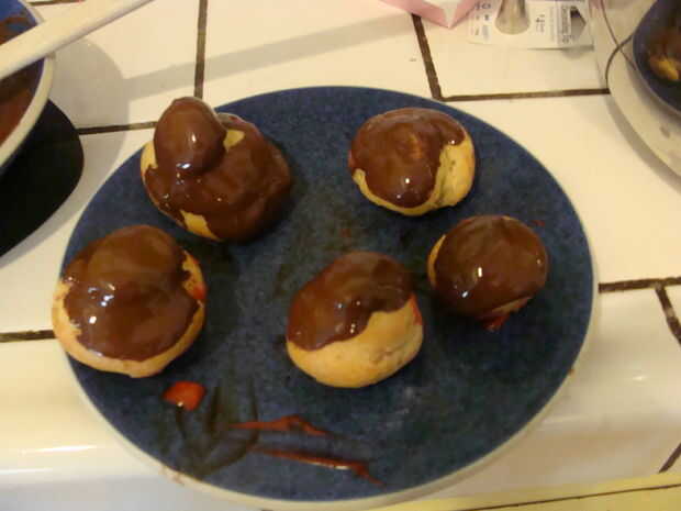 Ahora, para cubrir, tomar un hojaldre de crema, mojar la parte superior en el chocolate, dejó el drenaje de exceso un poco y ajustar hacia abajo sobre una rejilla o placa.