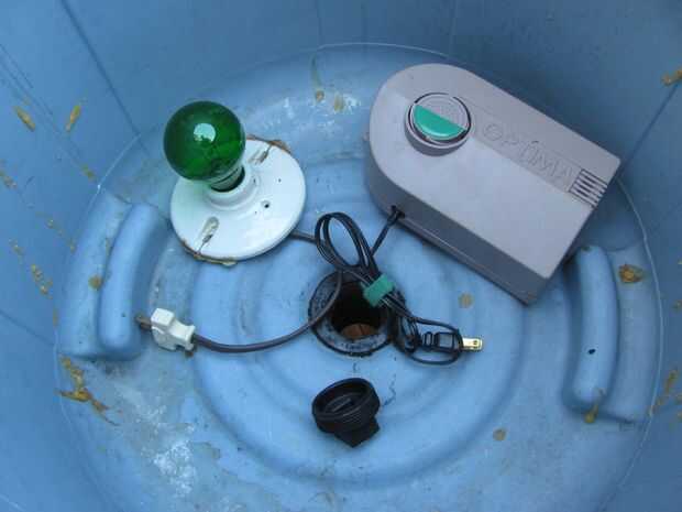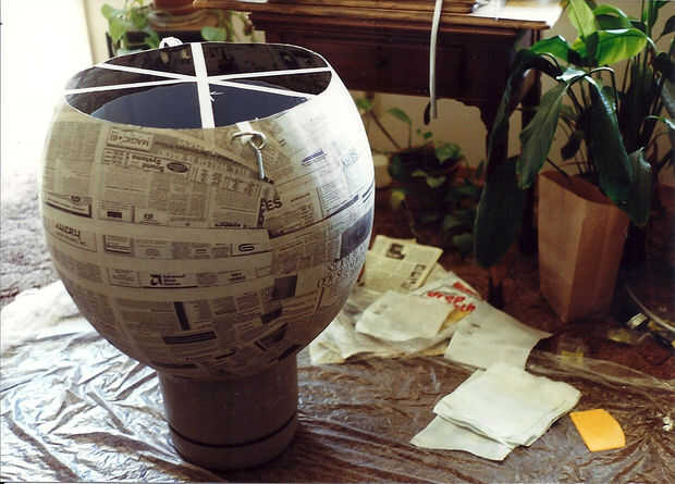 Para apoyar el caldero y dejar espacio para la luz trasera y bomba de aire un gran bote de basura plástico es corta en altura y colocado dentro de la bola de papel mache. La altura de la papelera se selecciona para permitir suficiente espacio desde el borde superior de la papelera para el borde de la caldera a la altura de la bandeja de líquido.