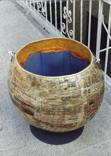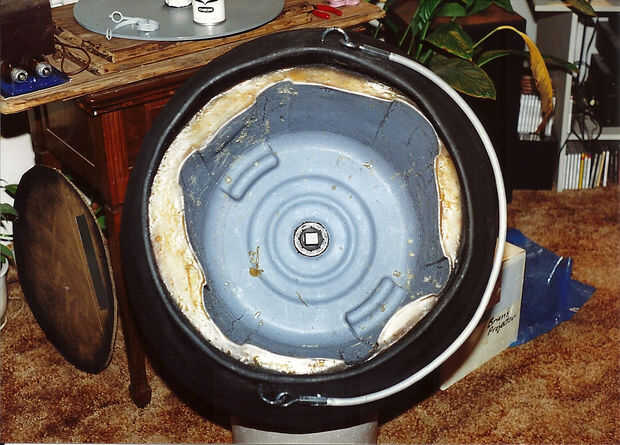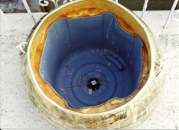 El borde superior (labio) de la caldera fue terminado y consolidado por tomar el pedazo de vinilo de gran diámetro de la tubería y corte a lo largo por lo que podría caber sobre el borde del labio de maché de papel rugoso. El tubo era tiro lleno de sellante de la espuma 'Grandes cosas' y se deslizó sobre el borde de papel maché y permite enlazar y endurecen.