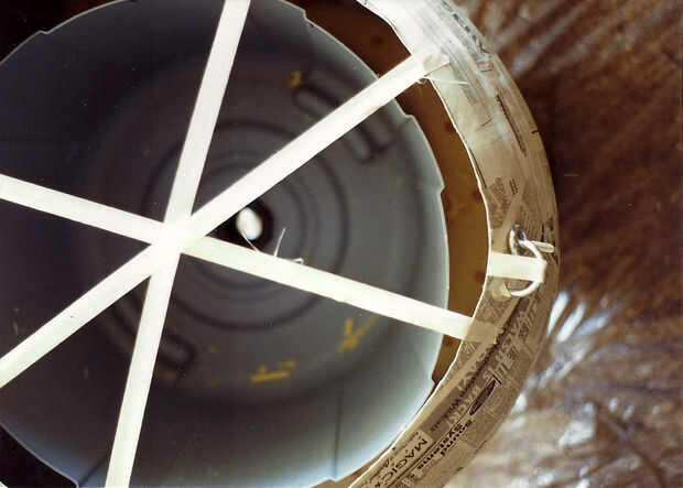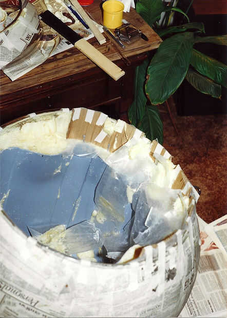 Foto 2: Un estante para apoyar la bandeja líquido se formó al terminar el relleno de la espuma hasta la parte superior del labio de la papelera. Para asegurar una superficie plana como la espuma llena el vacío, una forma de tapado de cera papel respaldado por la cartulina fue grabada en su lugar entre la papelera y papel maché para contener la espuma como se expandió. Después de cada vertimiento de espuma alrededor del perímetro de la papelera de la forma se trasladó para el próximo vertido.