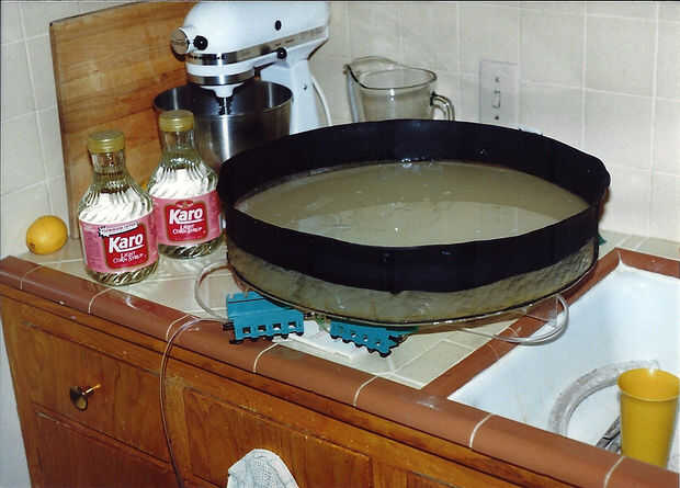 Originalmente pensé que utilizaría el jarabe de maíz Karo en la bandeja de pensar que el líquido viscoso espeso proporcionaría algunos más grandes formando lenta / estallido de las burbujas, pero realmente no se realizó muy bien. Era pegajosa, un gasto añadido y difícil de limpiar. Colocaron más adelante en llenar la bandeja con agua junto con el almidón de maíz en polvo mezclado en. El almidón de maíz añade opacidad al agua por lo que difunde el fondo luz de fondo y lo hizo para que no se veía la parte inferior de la bandeja y 'dedo maneja'. La bandeja se llena sólo a medio camino cuando esté en uso.